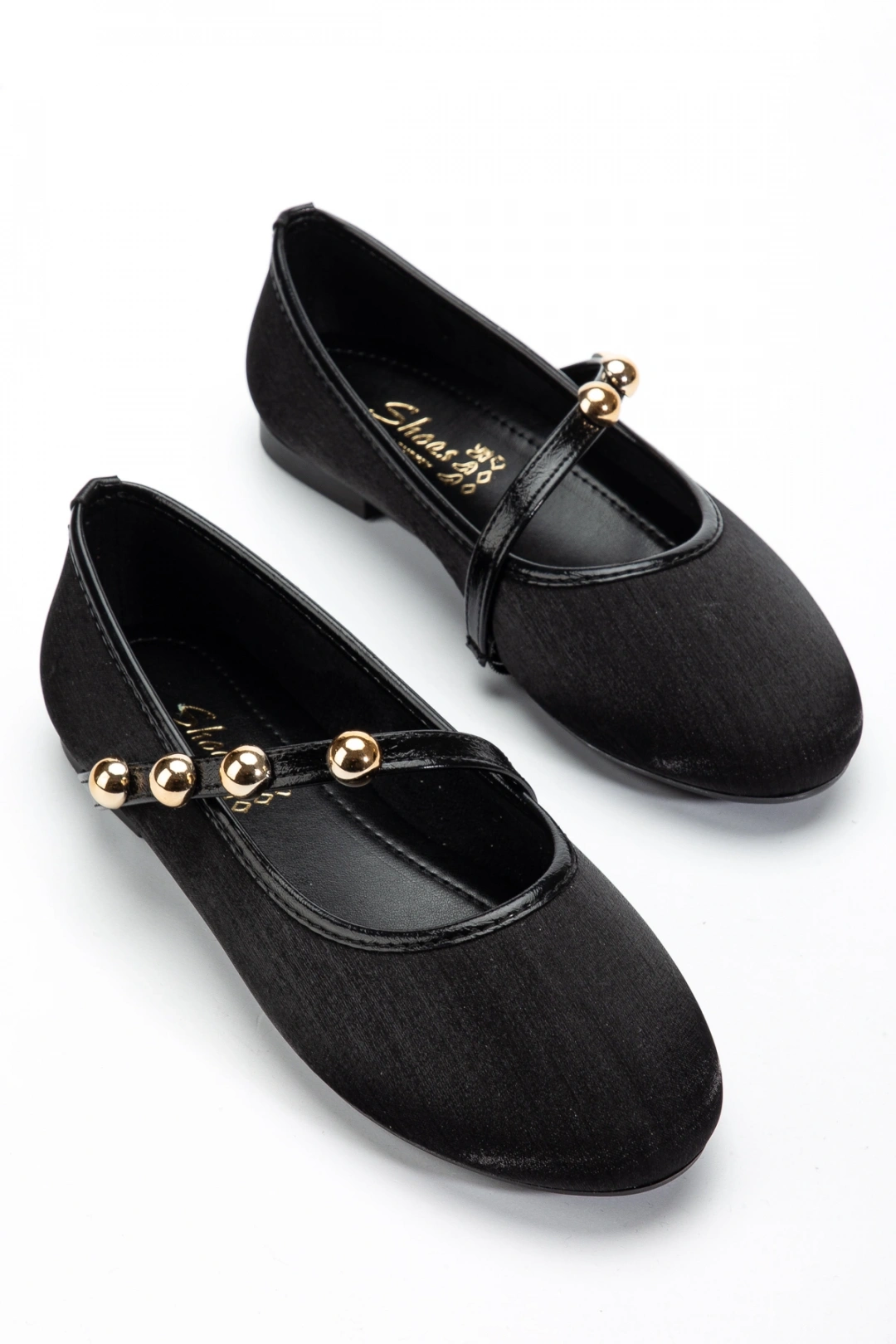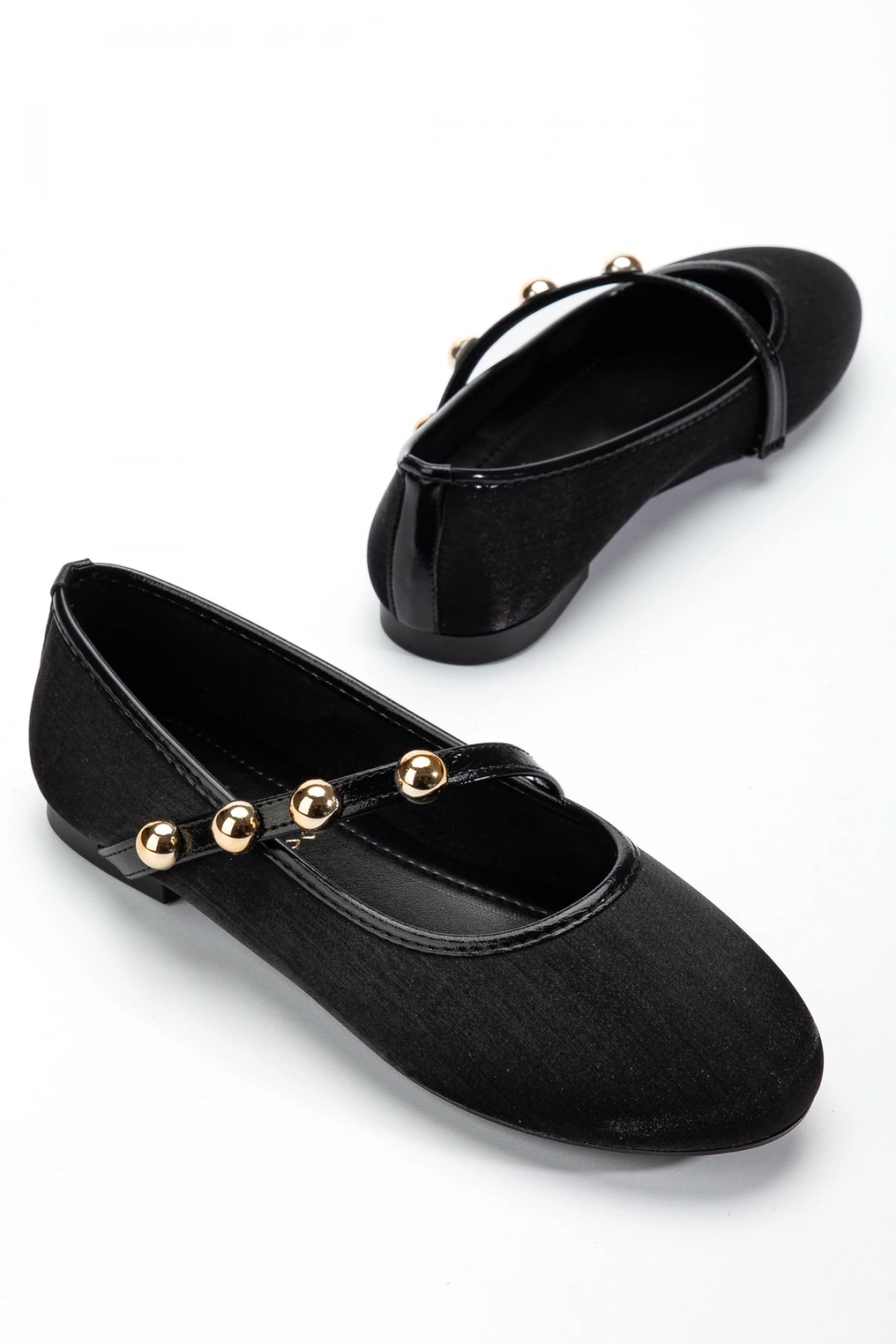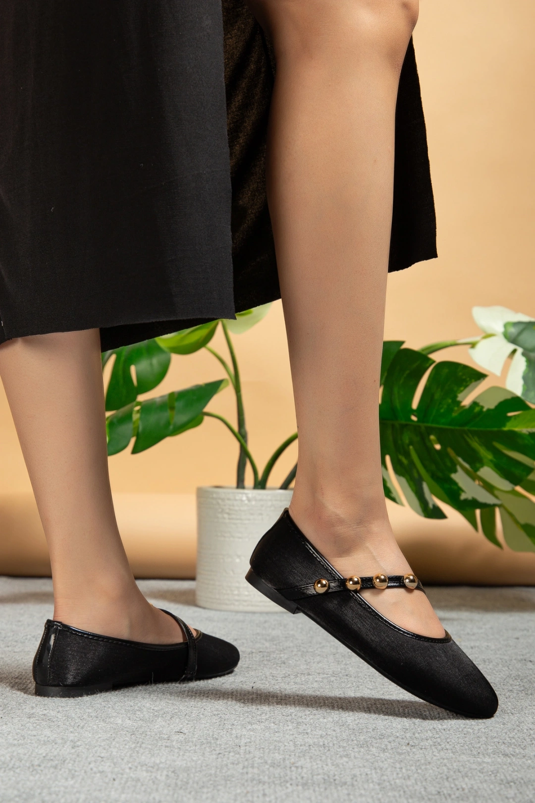 Kadın Siyah Gold Aksesuarlı Şık Parlak Kumaş Babet