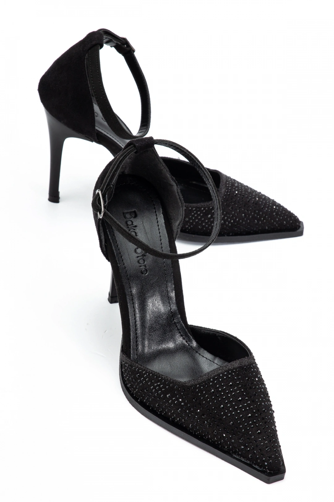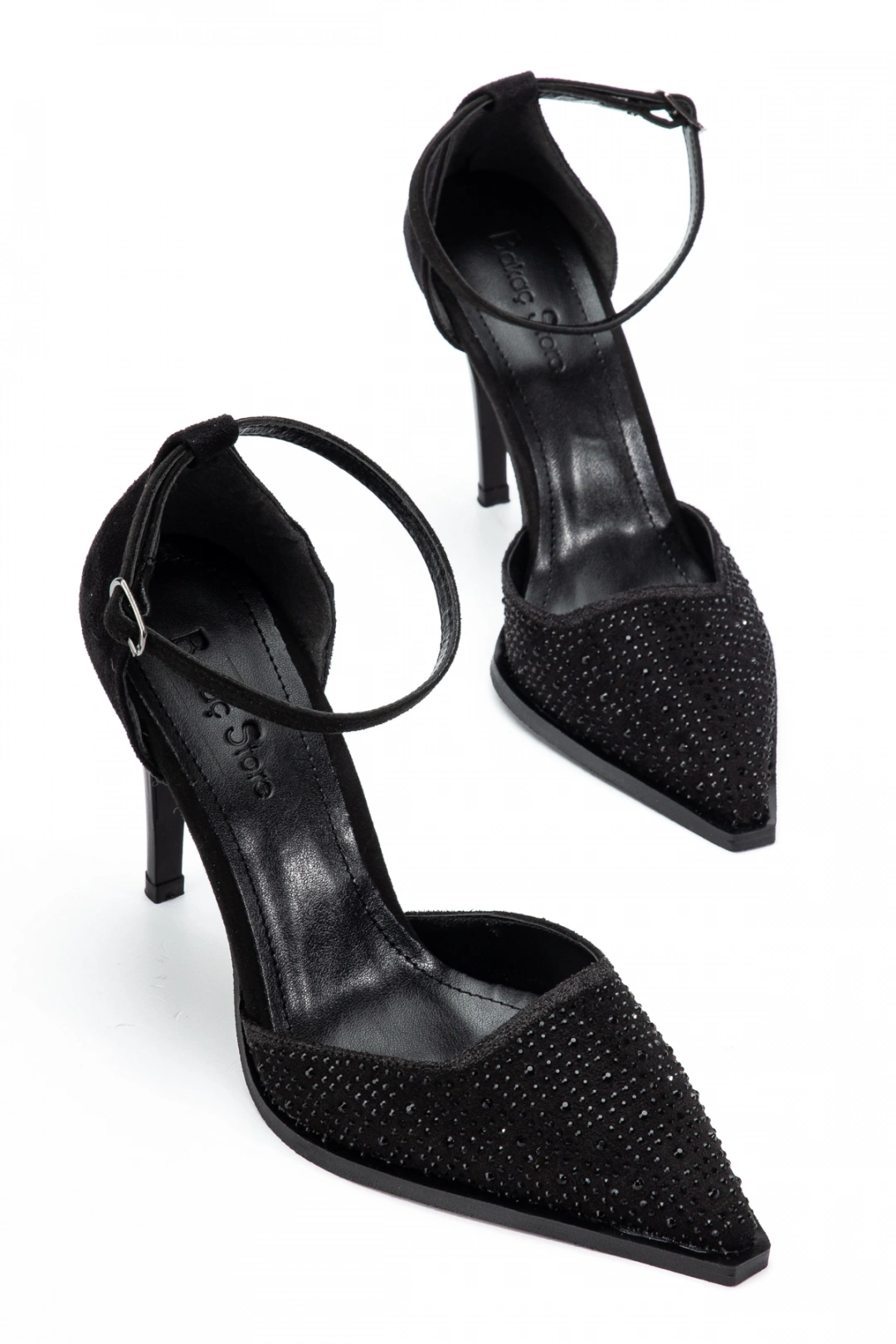 Kadın Siyah Parlak Taşlı Süet Kumaş Topuklu Ayakkabı