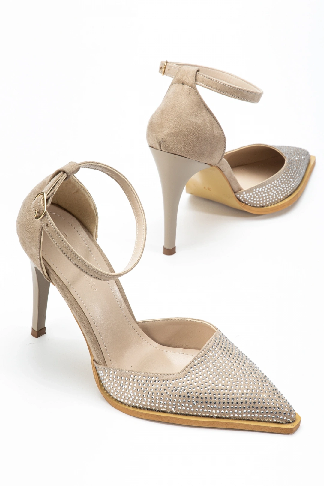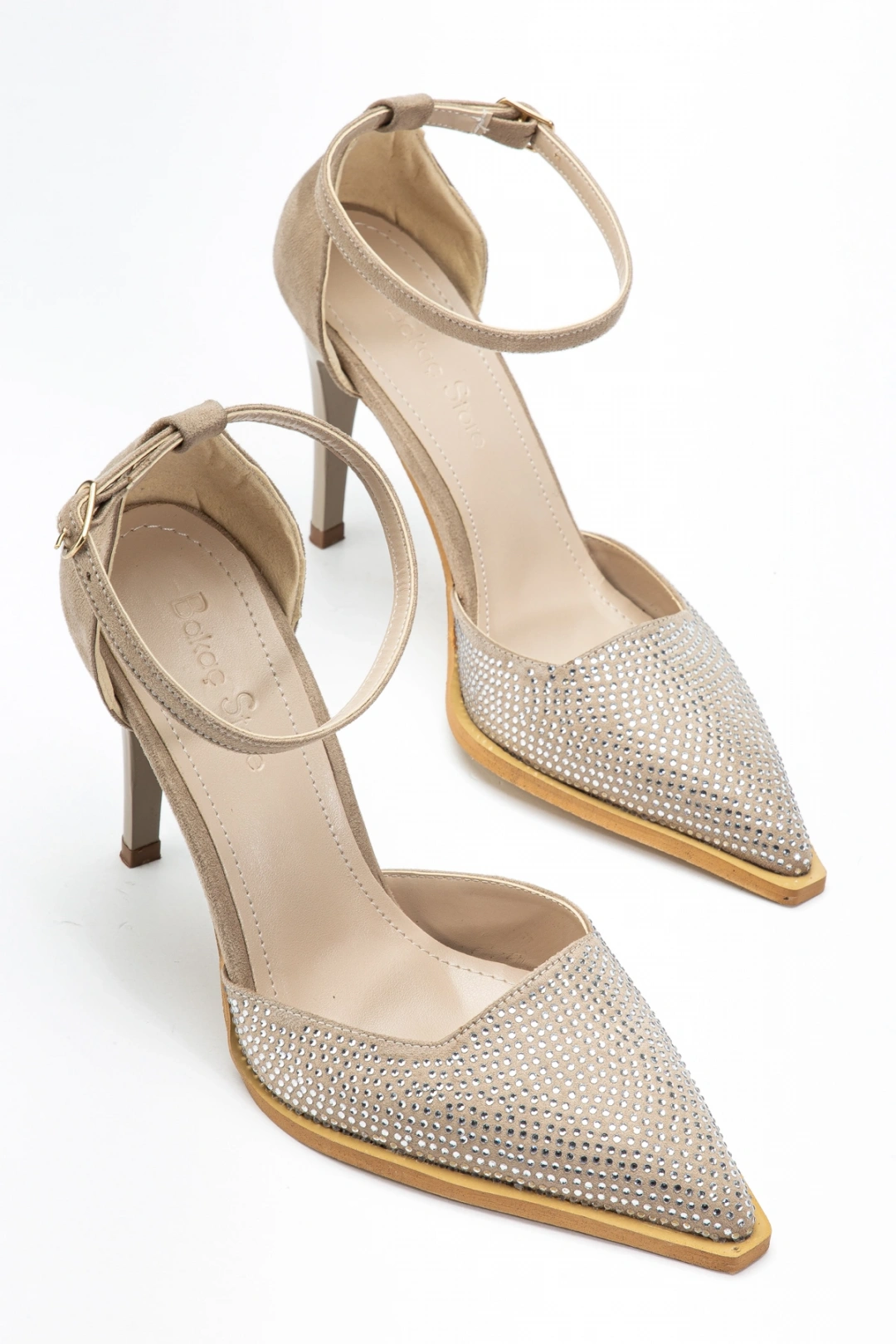 Kadın Bej Rengi Parlak Taşlı Süet Kumaş Topuklu Ayakkabı