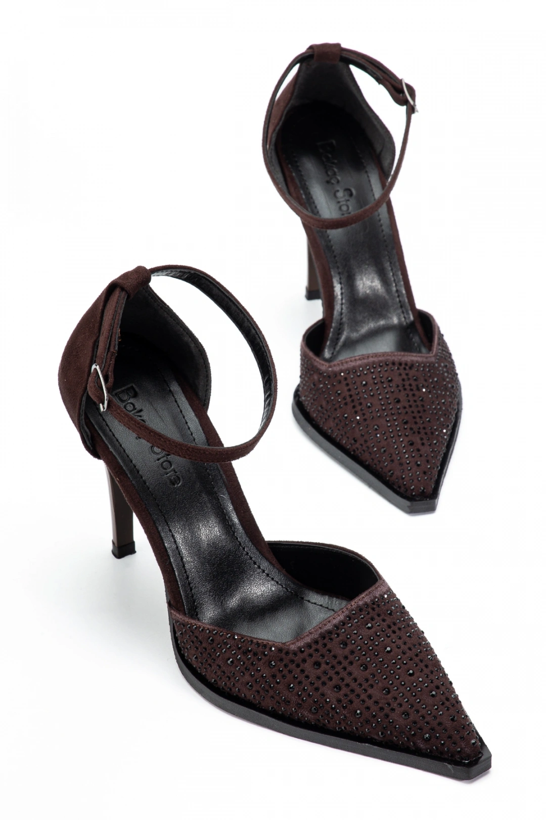 Kadın Acı Kahverengi Parlak Taşlı Süet Kumaş Topuklu Ayakkabı