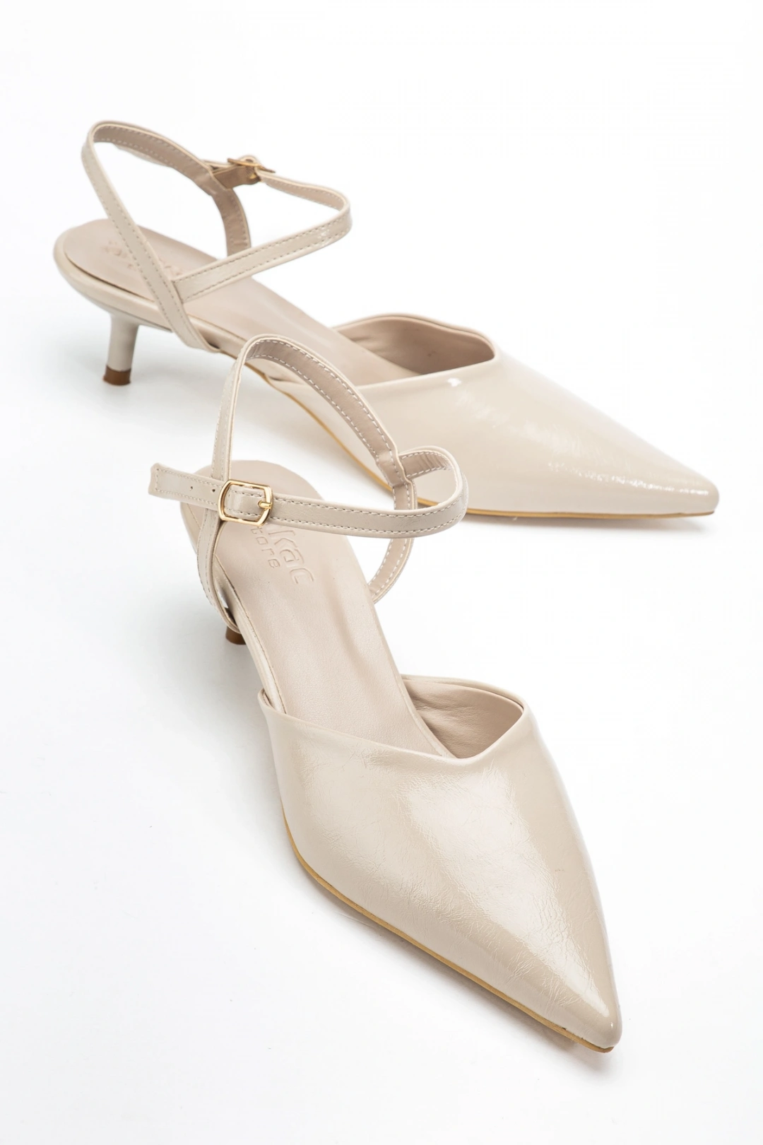 Kadın Bej Kırışık Rugan Çift Biyeli Topuklu Ayakkabı