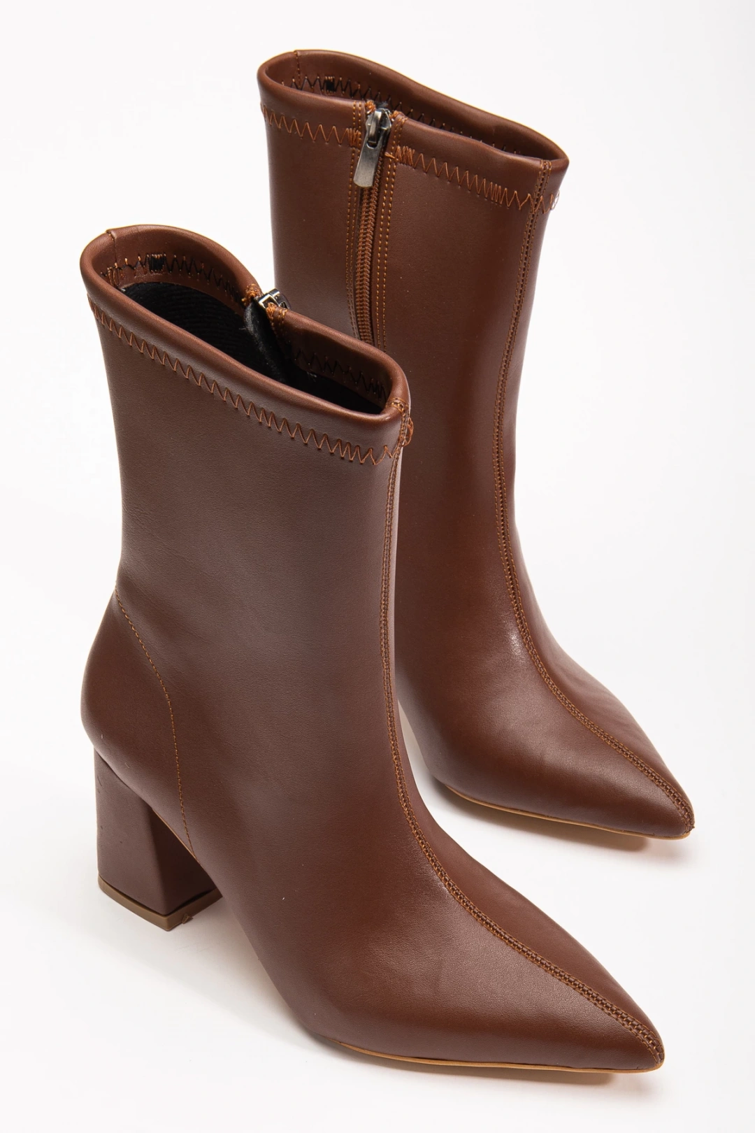 kadın kahverengi streç deri sivri burun fermuar detaylı topuklu bot