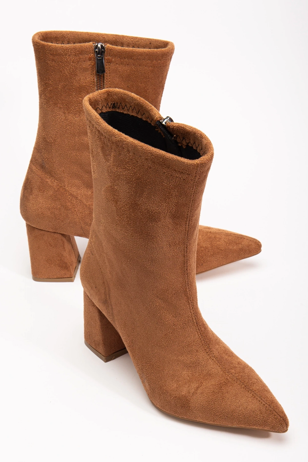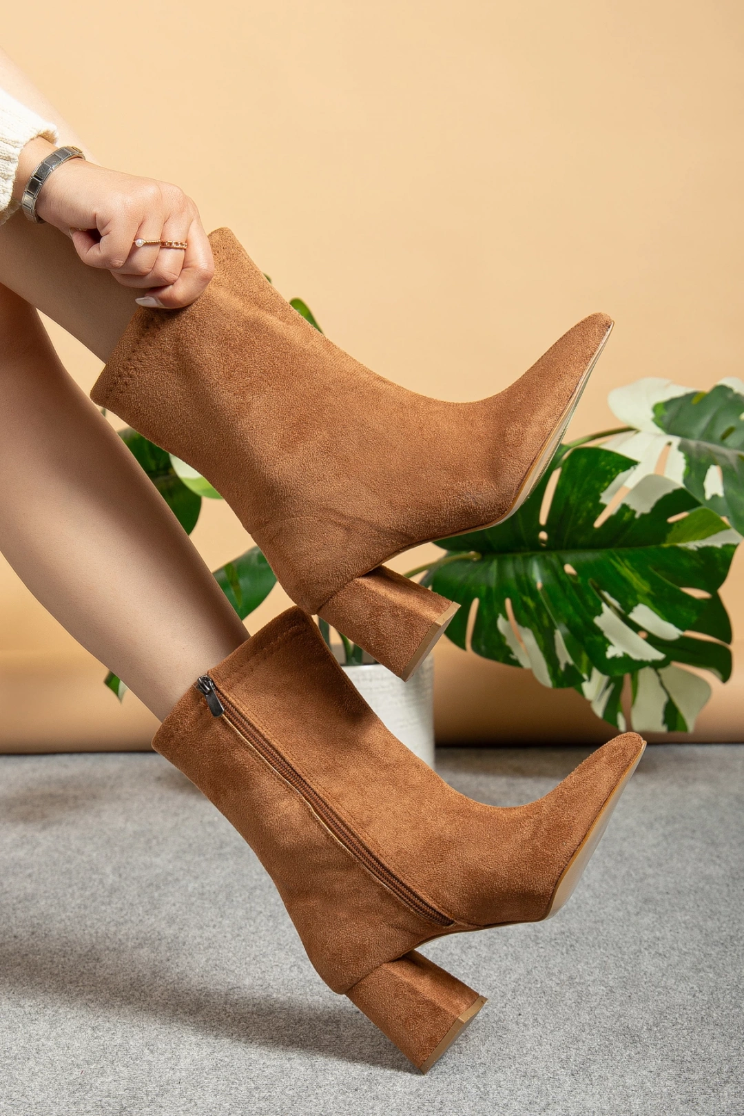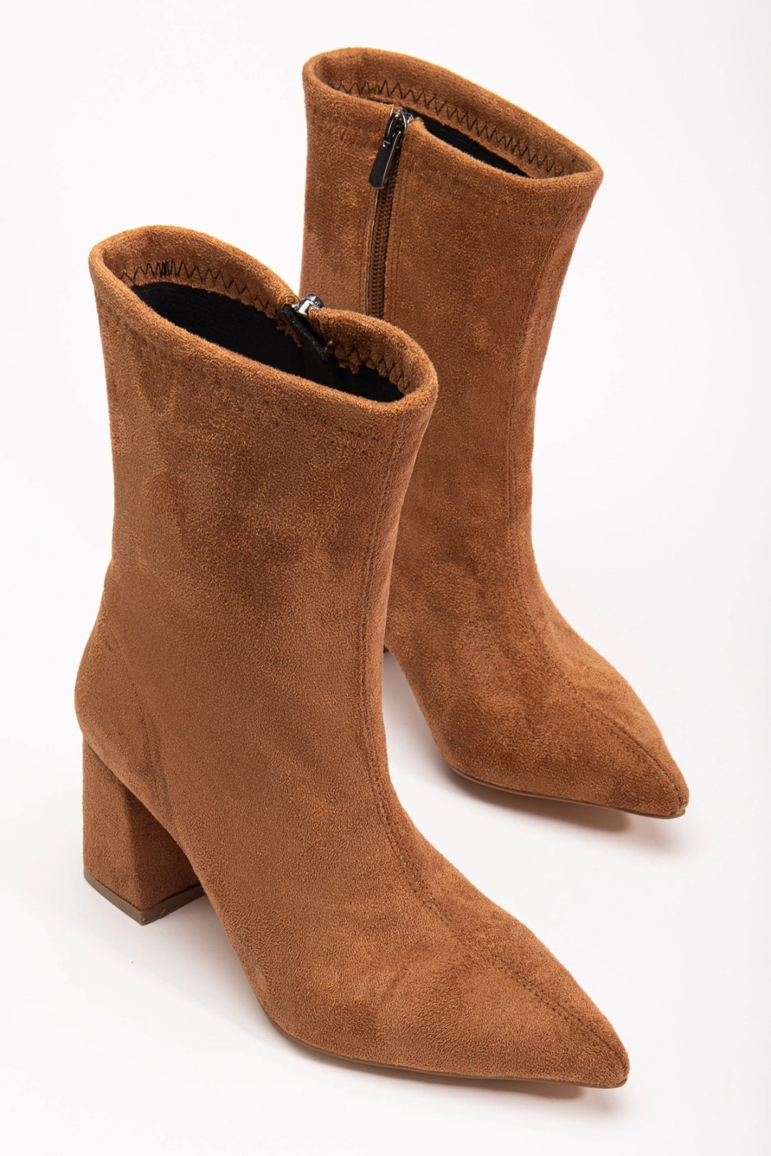 Venessa Kadın Taba Süet Sivri Burun Orta Boy Topuklu Bot