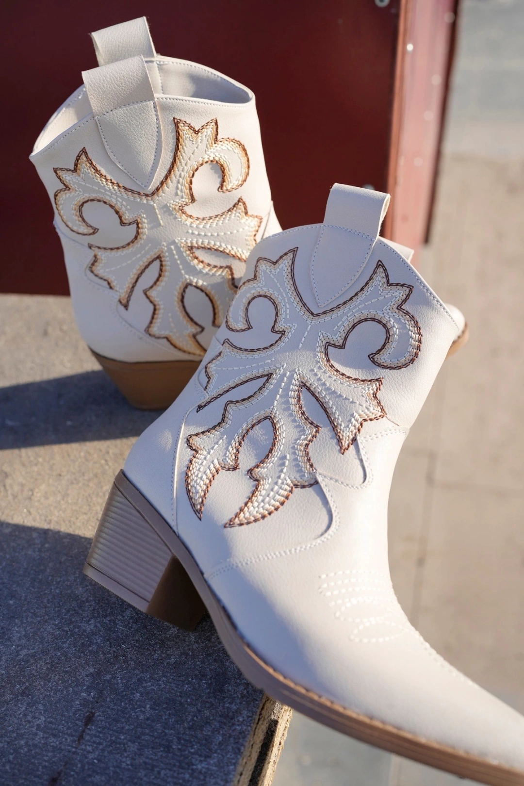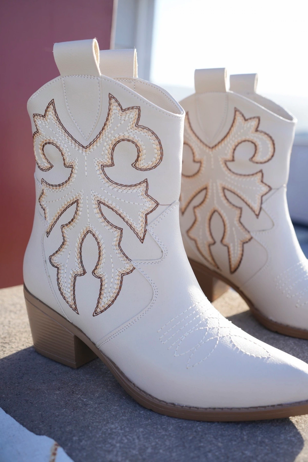 Yeni Bej Deri Kahve Nakışlı Kısa Topuklu Kovboy Kadın Bot